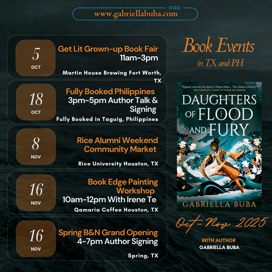Gabriella Buba is a mixed Filipina-Czech author-illustrator and chemical engineer based in Texas who likes to keep explosive pyrophoric materials safely contained in pressure vessels or between the covers of her books. She writes epic fantasy for bold, bi, brown women who deserve to see their stories centered. Her debut SAINTS OF STORM AND SORROW, a Filipino-inspired epic fantasy, was shortlisted for the 2025 Aldiss Award for World Building in Speculative Fiction. The sequel DAUGHTERS OF FLOOD AND FURY was a top trending Spotify LGBTQ+ Audiobook title. Her work as part of the anthology Witchcraft: Folk Tales & Horror Short Stories edited by Marie O'Regan & Paul Kane was a #1 New Release on Amazon. She has a Gothic Novella set during the Japanese Occupation of Manila coming with Absinthe Books Fall of 2026.She has a Filipino Fantasy short stories in the anthologies Strange Religion: Speculative Fiction of Spirituality, Belief, & Practice & Of Stardust: A Queer Fantastical Anthology volume 1 & 2, Short stories placed with the Sci Phi Journal and PodCastle Fiction and essays on Filipino Identity in Prairie Fire Press and With Love: What We Wish We Knew About Being Queer and Filipino in America